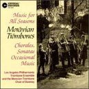 Probably the most important recordings of Moravian trombone choir music are a pair of LPs supervised by Jeffrey Reynolds over 30 years ago: Music of the Moravian Trombone Choir (Crystal Records, Stereo S222, issued 1976), and Music for Two Seasons (Crystal Records, Stereo S225, issued 1981). I have already discussed Reynolds's contribution to the tradition above -- these LPs document not only traditional Moravian trombone style but also the works composed and arranged by Reynolds and others for the Moravian Trombone Choir of Downey. Music of the Moravian Trombone Choir is played by a small group of LA Philharmonic players and a couple of LA freelancers. This recording focuses primarily on the traditional chorales, but also includes a set of three 18th-century sonatas for SATB Posaunenchor by Cruse. Music for Two Seasons is played by an ensemble of twelve players from the Downey Trombone Choir. The two seasons are, of course, Advent/Christmas and Lent/Easter, and the LP brings together some traditional Moravian repertoire (e.g., both the Leinbach and Gregor Hosannas, and a few chorales) with several pieces written by Reynolds and other for the Downey group. In 1995, Crystal Records reissued both recordings together on a single CD, titled Music for All Seasons (Crystal Records, CD220). This reissue replicates all of the useful liner notes from the original LPs as well. You can purchase this disk directly from Crystal Records, and it is widely available through the usual online outlets.